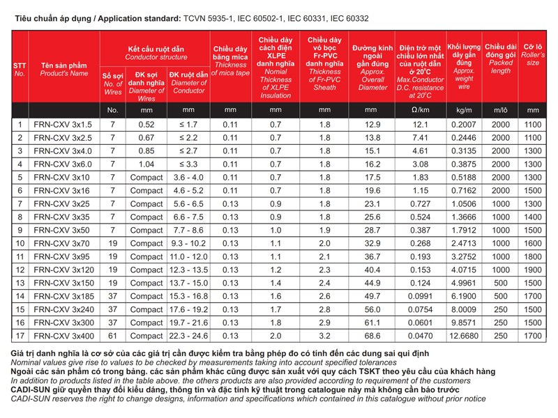– Quy cách: Cu/Mica/XLPE/Fr-PVC