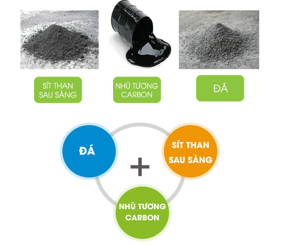 Carboncor Asphalt sử dụng 3 thành phần chính là: Đá, sỉ than sau sàng (rác than) và nhũ tương đặc biệt để kết cấu. Liên kết dính bám và cường độ của Carboncor Asphalt được hình thành do phản ứng giữa nước, không khí với nhũ tương đặc biệt và nguyên tử Carbon trong rác than, phản ứng này làm cho vật liệu Carboncor Asphalt liên kết thành một khối bền vững với nền đường. Do đó tạo ra một bề mặt chắc chắn, có sức bền tốt, có độ chống thấm nước, chống trơn trượt (độ nhám cao) và đi lại dễ dàng. Kết hợp giữa nước và bitumen làm cho vật liệu có khả năng bám rễ xuống móng đường từ 5 – 7 mm, tạo nên khả năng bám dính của vật liệu với móng đường hiện trạng. Cường độ của vật liệu được hình thành dưới tác dụng của nhiệt độ (làm bay hơi nước), các phương tiện giao thông, và bitumen làm các hạt được liên kết thêm chặt chẽ với nhau đảm bảo cường độ của vật liệu. Cường độ được hình thành cực đại sau 2- 3 tháng, phụ thuộc vào mật độ giao thông và điều kiện thời tiết. Video giới thiệu về sản phẩm Carboncor Asphalt: